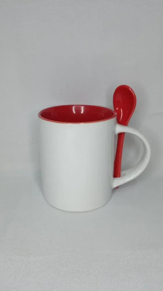 Caneca branca em cerâmica de qualidade, com interior e colher colorido.